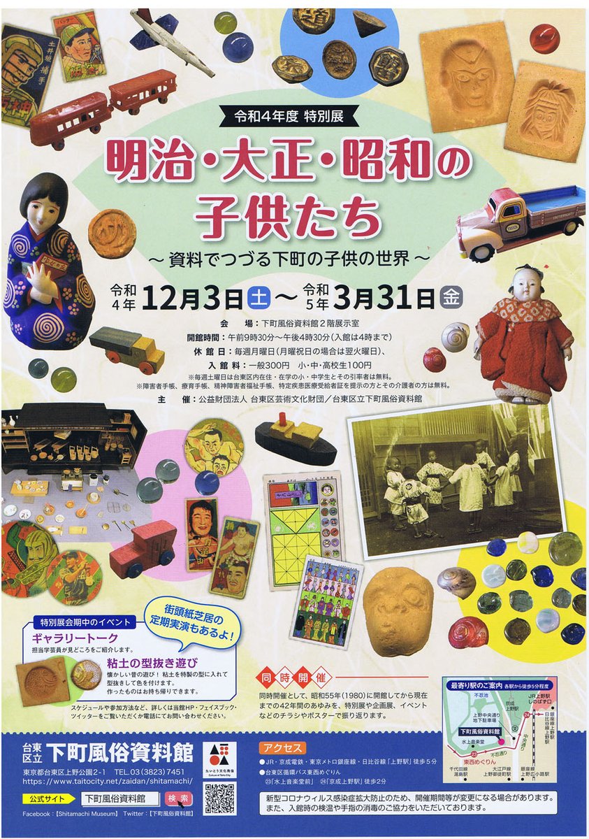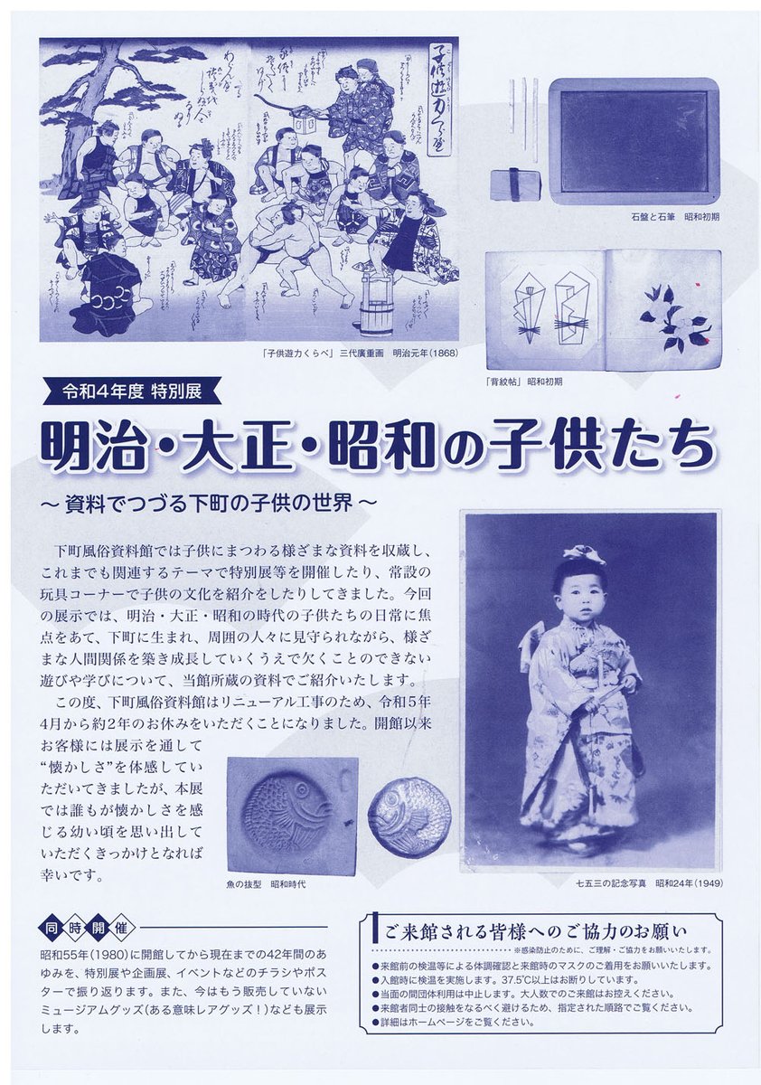 本日より、5年3月31日(金)まで特別展「明治・大正・昭和の子供たち ~資料でつづる下町の子供の世界~」を開催します。本展では子供のにまつわる遊びや学びなどを、当館所蔵の資料でご紹介します。