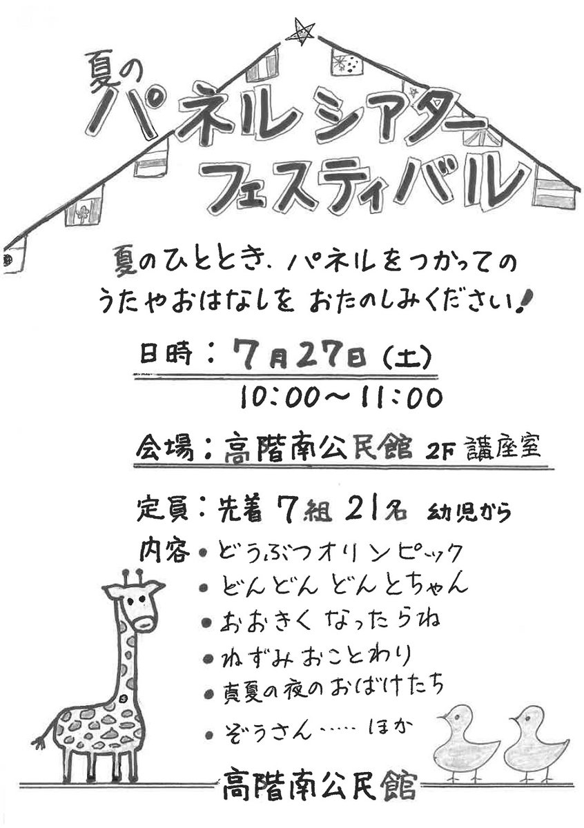 高階南公民館です。7月27日(土)午前10時から高階南公民館で「パネルシアターフェスティバル」を開催します。パネルの上に広がる不思議な物語の世界へようこそ!どんなお話が待っているのかな?ぜひ遊びに来て..