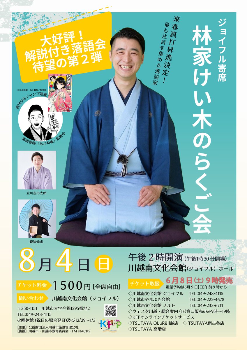 文化芸術振興課です。8月4日(日曜)14時から、川越南文化会館で「ジョイフル寄席林家けい木のらくご会」を公演します!今、大注目の落語家「林家けい木」によるわかりやすい解説付きのらくご会!ぜひ、ご来場く..