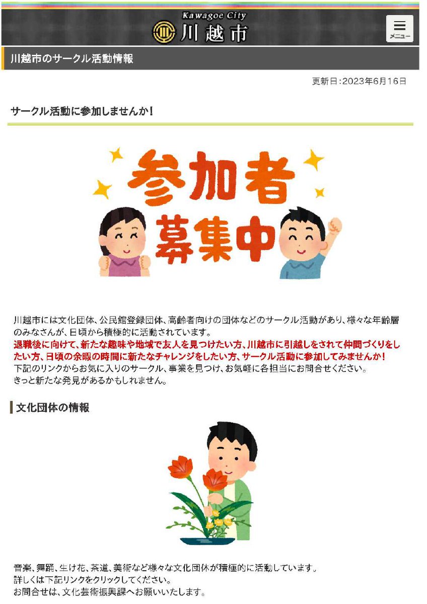文化芸術振興課です。川越市では文化団体、公民館登録団体、高齢者向けの団体など、様々な年齢層のみなさんが日頃から積極的に活動されています。退職後に向けて新たな趣味を見つけたい方、余暇の時間に新たなチャレ..