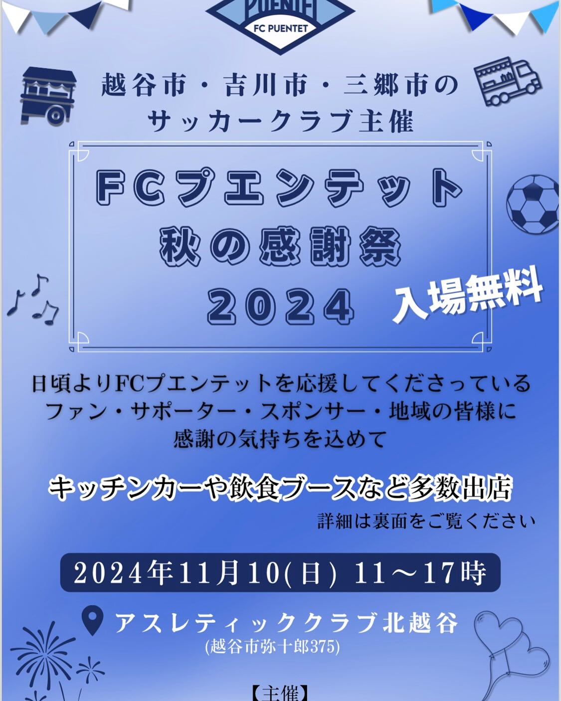 いつもありがとうございます♪明日の日曜日は北越谷にて出店‼️FCプエンテット感謝祭11:00〜17:00当店販売商品ドリンク各種トルティーヤ各種カップどらやき各種ミネストローネスープ(フランスパン付)..