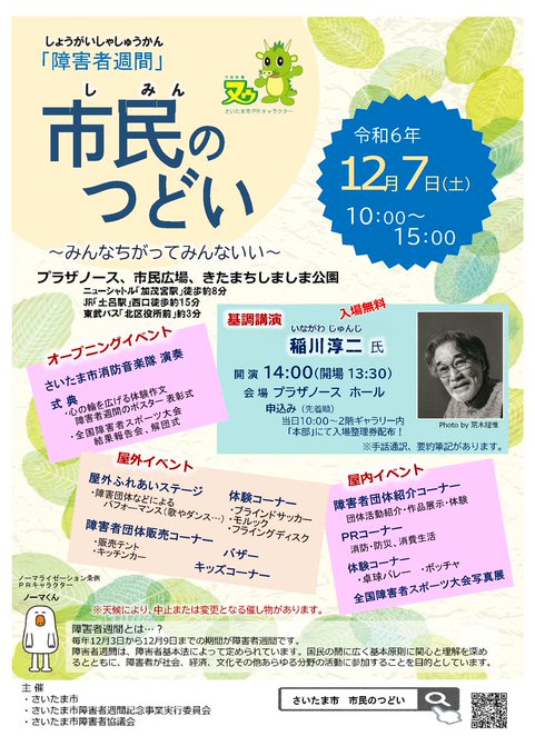 (障害・難病のある方からの作品を募集します) 令和6年度「障害者週間」市民のつどいにおいて展示する作品(絵画、写真、書、陶芸・工芸、手芸、川柳・俳句・短歌、生け花等)を募集します。 申込期限:10月25日(金) ご応募お待ちしてます。 詳しくはリンク先へ。 https://city.saitama.lg.jp/002/003/004/001/009/001/p115726.html… #さいたま市
