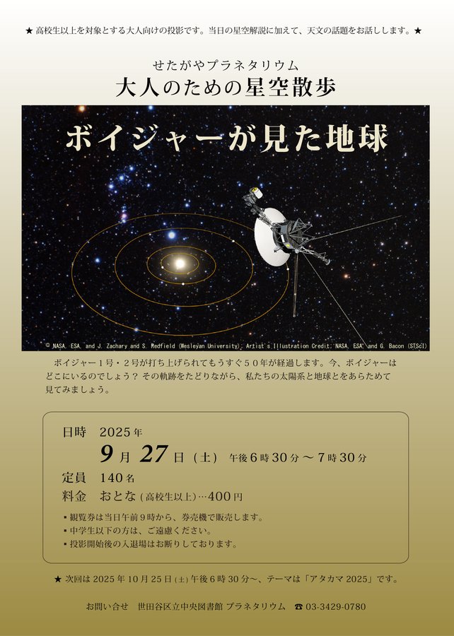 \大人のための星空散歩開催します/ 日 時:27日(土)18:30~ テーマ:ボイジャーが見た地球 概 要:星や宇宙などの天文等について取り上げお話します 対 象:高校生以上 料 金:400円 定 員:先着140名 詳細はHPをご覧ください。 #世田谷 #プラネタリウム