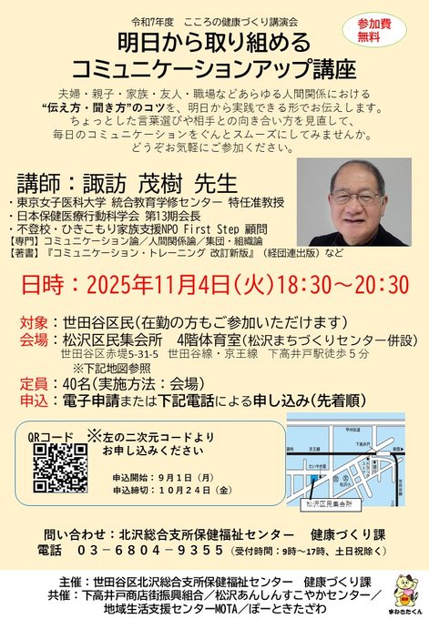 11月4日(火)こころの健康づくり講演会「明日から取り組めるコミュニケーションアップ講座」諏訪茂樹先生を講師にお迎えして、松沢区民集会所にて開催します。詳細は区のホームページをご覧ください。 #世田谷 https://city.setagaya.lg.jp/02208/27545.html…
