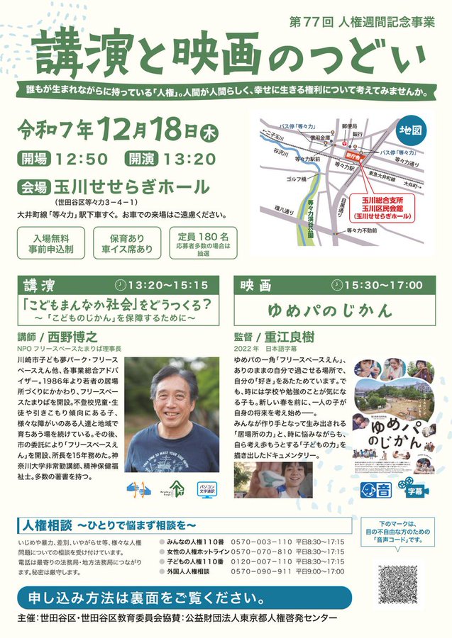 【12/18】第77回人権週間記念事業「講演と映画のつどい」を開催!【玉川せせらぎホール】 西野博之氏(NPO法人フリースペースたまりば理事長)による講演や、映画「ゆめパのじかん」を上映。 要事前申込(〆12/4)。詳細は区HPをご覧ください。 #世田谷 #人権週間 https://city.setagaya.lg.jp/02059/online_tetsuzuki/3571.html…