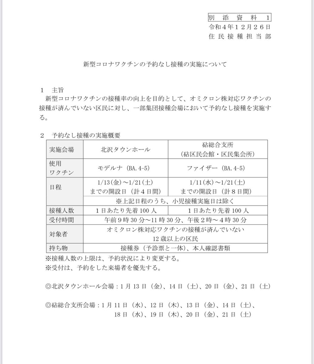 世田谷区内の2会場で、オミクロン株対応ワクチンの予約なし接種が実施されます。