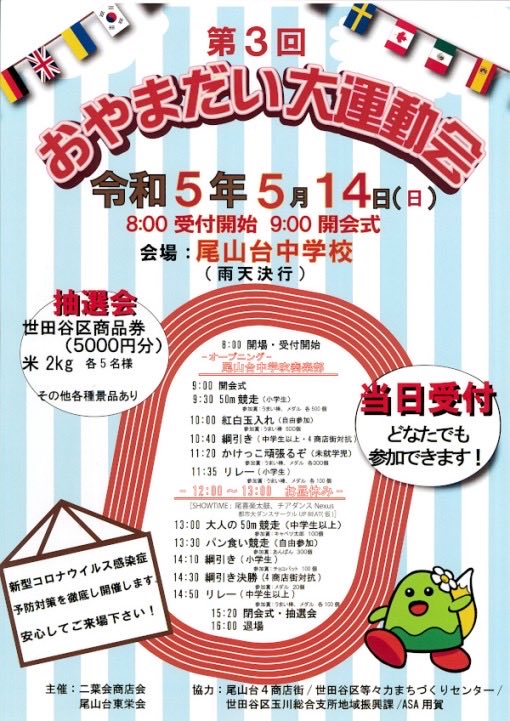 地域行事もコロナ禍前の様になりつつあります。尾山台駅周辺4商店会が中心となって地域「運動会」が4年ぶりに開催されました。ラジオ体操をしていて身体が硬くなっている事に気が付きました。