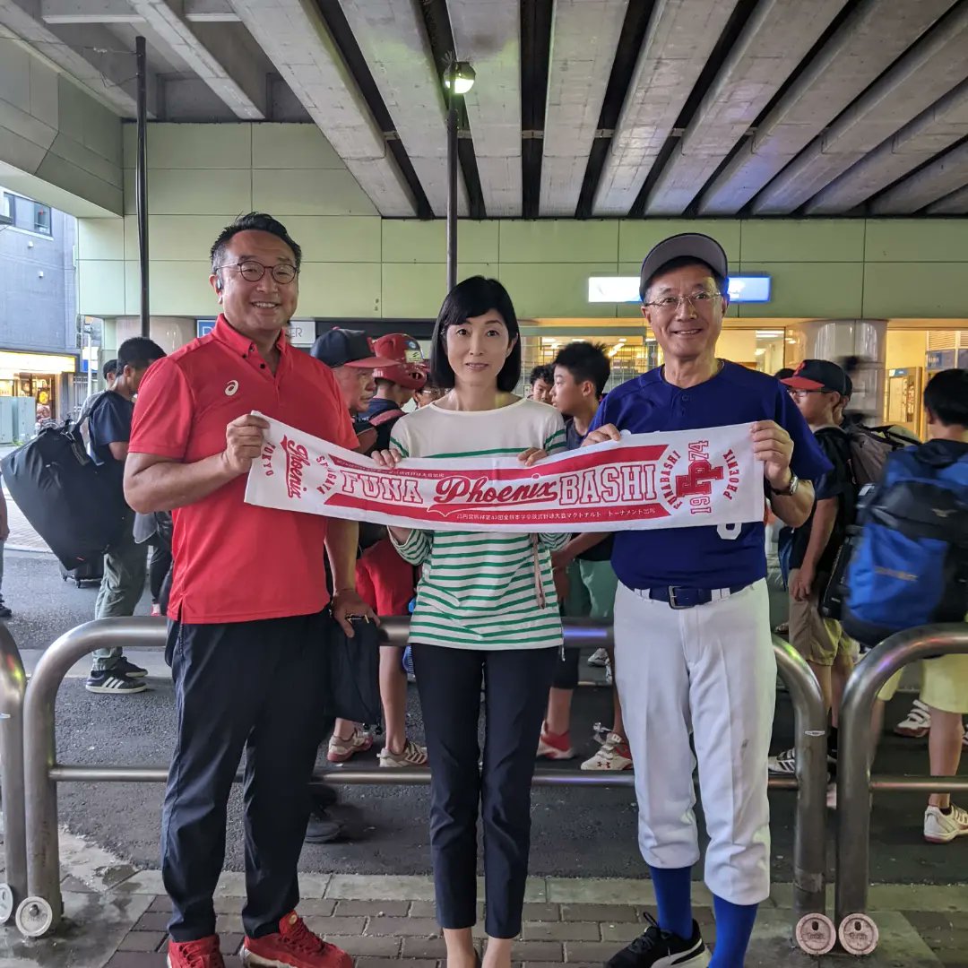 石川ナオミ幹事長と宍戸三郎副幹事長とともに一球必勝とこの夏の最高の思い出と成るよう事を祈念してのお見送りです✨。