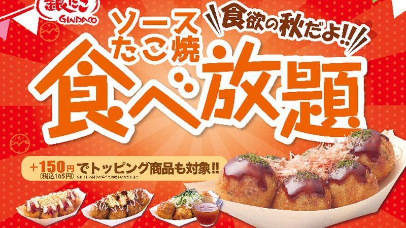 11/20(月)、21(火)、22(水)、24(金)の4日間、イオンモール内の"築地銀だこ"33店舗で「食べ放題企画」開催。45分間1,078円。事前に店頭で予約が必要です→event-checker.info/gindaco-b..