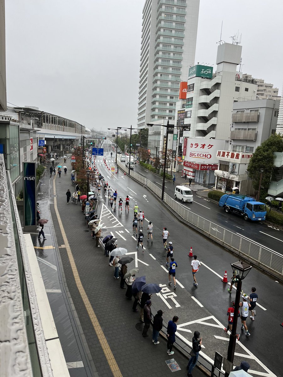 雨で冷え込む朝、246ハーフマラソン開催中‼️二子玉川駅前、交通規制されており、歩行者も歩道橋を渡る形になっていました🙇♀️区の職員の皆様とお会いしました。雨の中、ご参加の皆様、イベントをお支えくださる皆様、本当にありがとうございます。