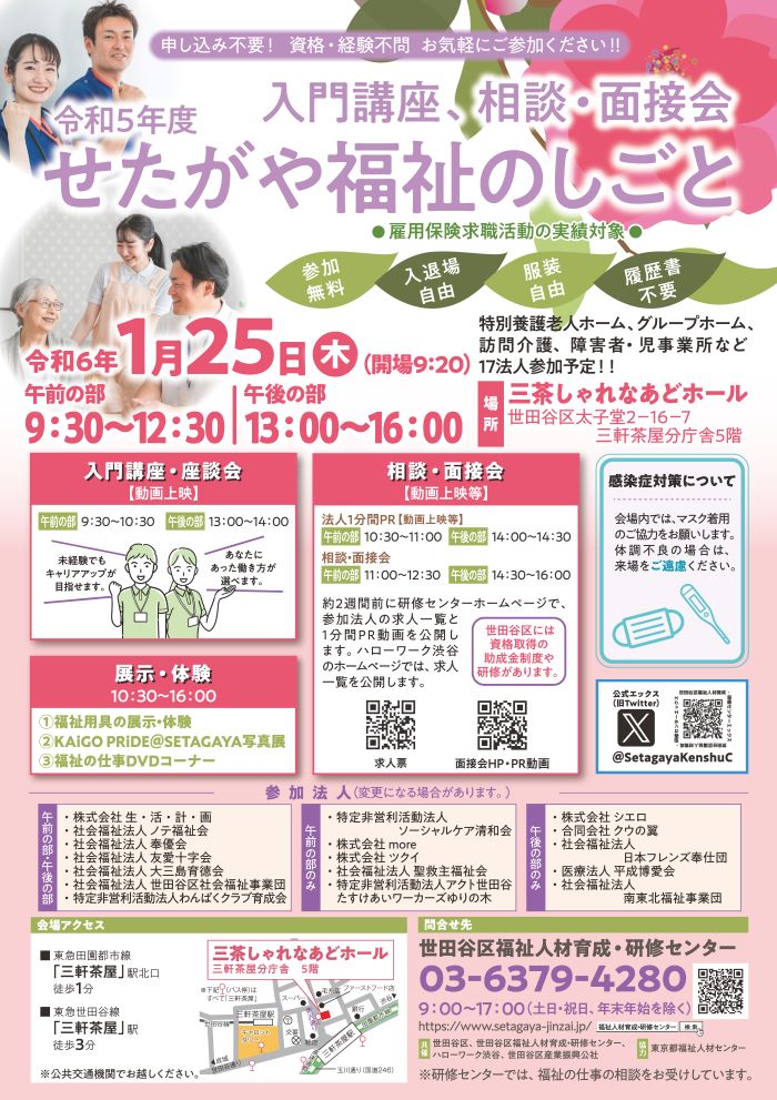 令和6年1月25日(木)に三茶しゃれなあどホールで「せたがや福祉のしごと入門講座、相談・面接会」を午前・午後2回開催します。介護・福祉の仕事を始めたい方、関心のある方、復職を考えている方々ご来場ください。雇用保険求職活動の実績対象です。詳しくはホームページまで。 #介護 #福祉 #就活