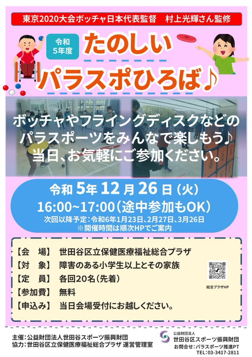 12月26日(火)16:00~17:00で『たのしいパラスポひろば』を開催いたします!障害のある小学生以上の方が対象で、参加は無料です✨事前申込は不要ですので、当日会場にお越しください。皆さまのご参加を心よりお待ちしております😊