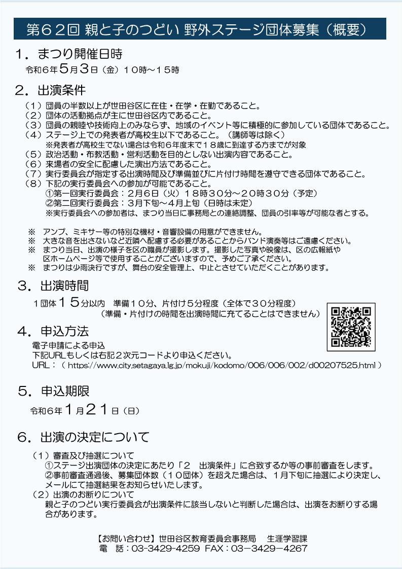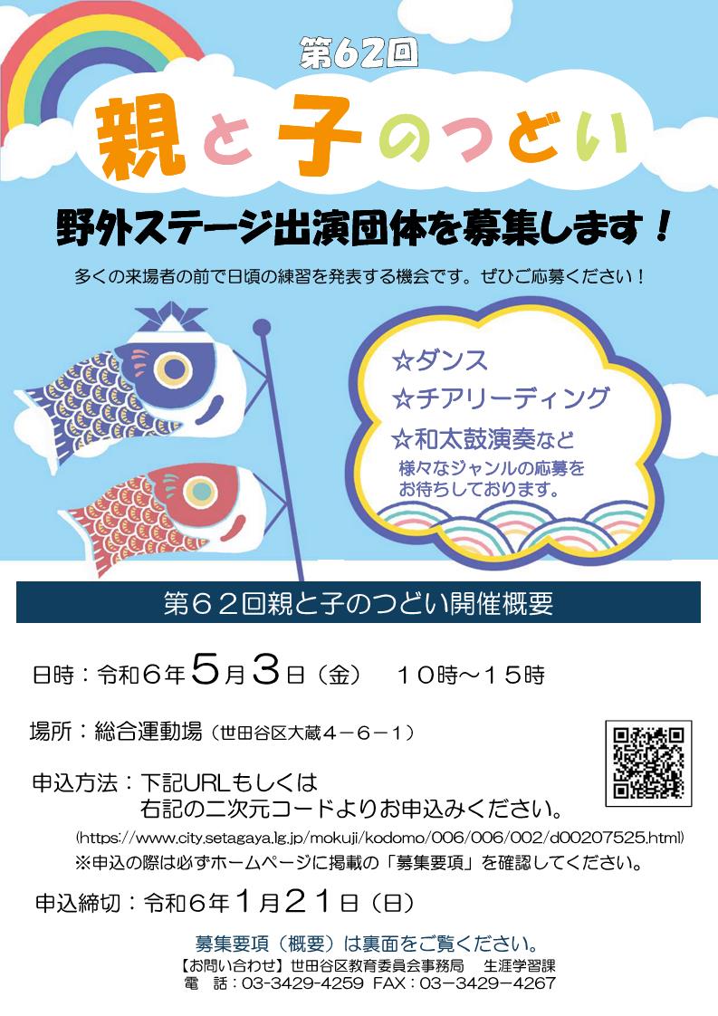 総合運動場にて令和6年5月3日に開催予定の「親と子のつどい」野外ステージに出演する団体を募集します。申込は1/21まで。詳細はHPをご確認ください。 #世田谷