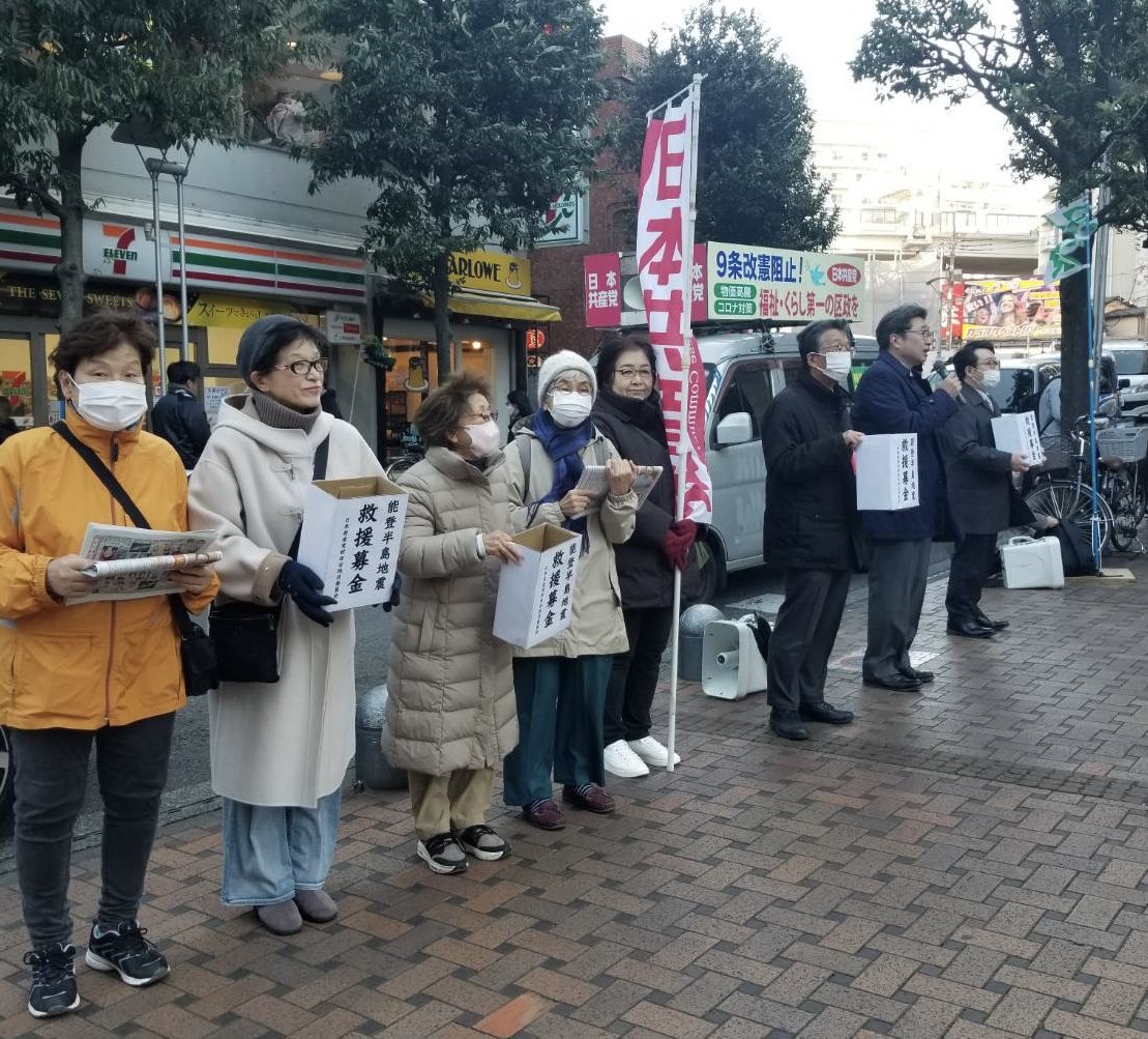 世田谷では三軒茶屋と二子玉川で、能登半島地震募金活動もやります、と声をかけたら、地域の党員がそれぞれの駅で20人ほど集まりました。