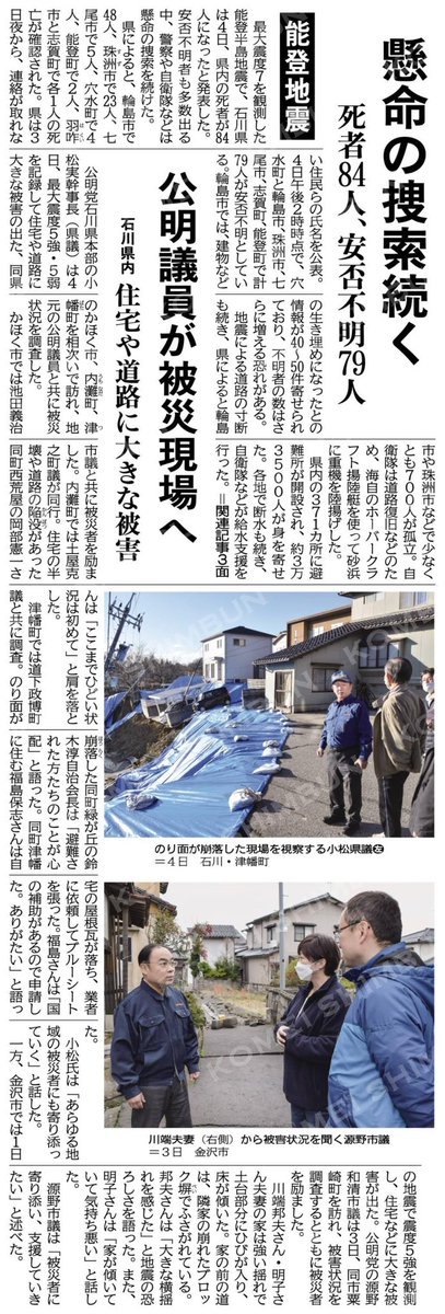 #いたいひとし 懸命の捜索が続いています。 公明党の議員も現場に入っています。現場で直接、被災者の声を聞き肌で感じることで、被災者に寄り添えます。 (能登地震)懸命の捜索続く/死者84人、安否不明79人 #公明新聞電子版 2024年01月05日付け