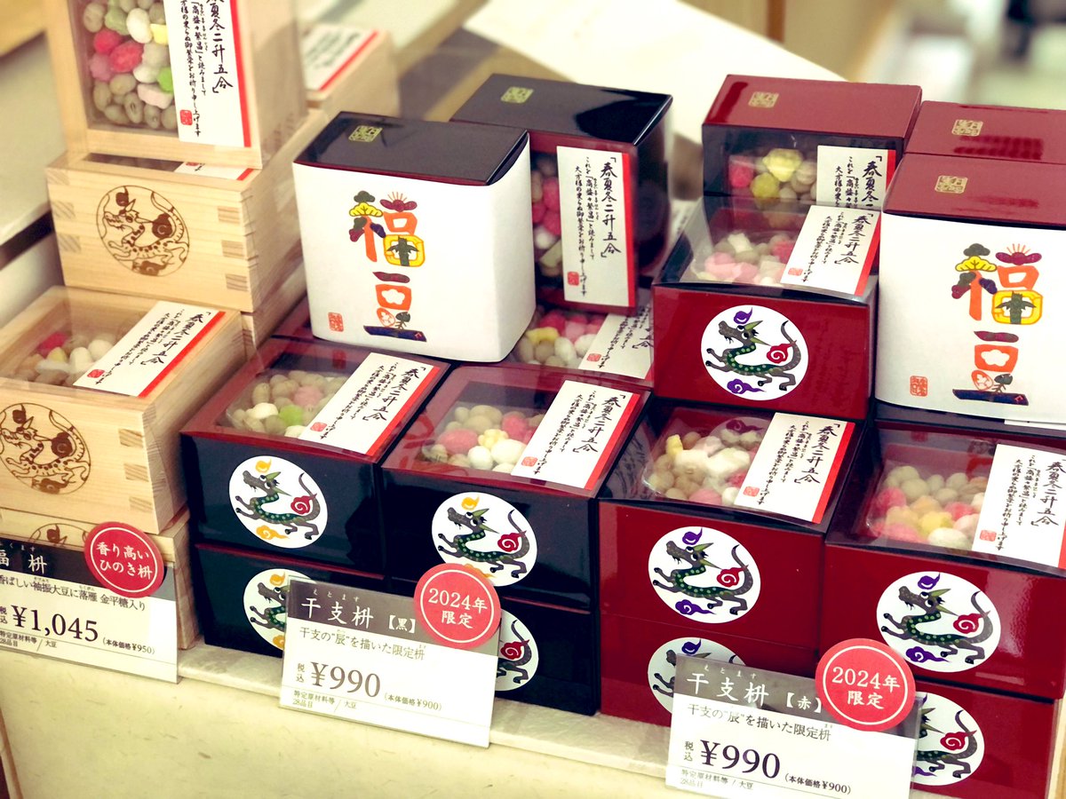 年が明けたと思ったら、もう #節分 の豆が並んでる…とはいえ辰の枡、かわいい。