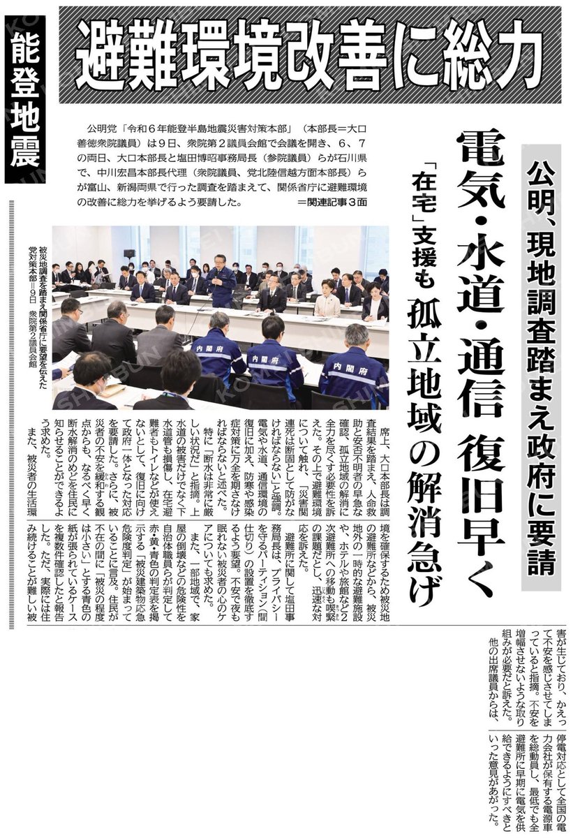 (能登地震)避難環境改善に総力/電気・水道・通信復旧早く/公明、現地調査踏まえ政府に要請 #公明新聞電子版 2024年01月10日付 www.komei.or.jp/newspaper-app/