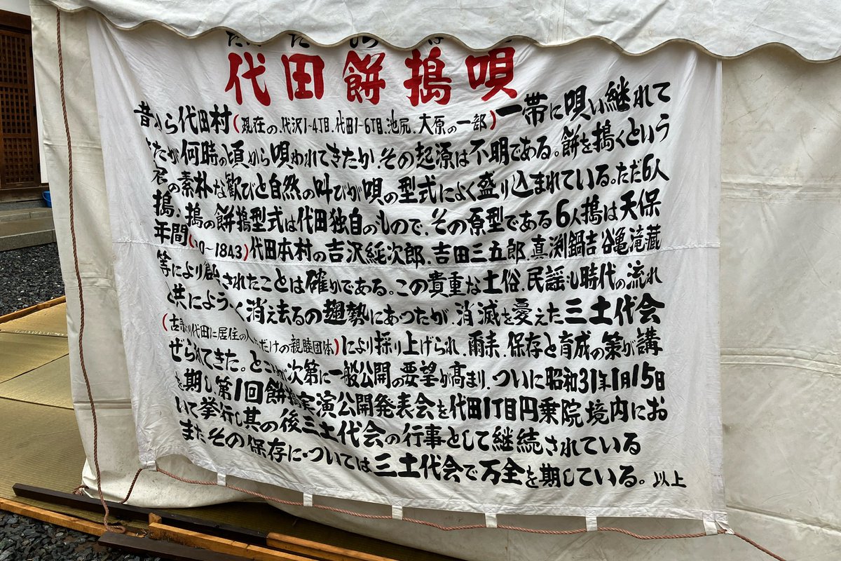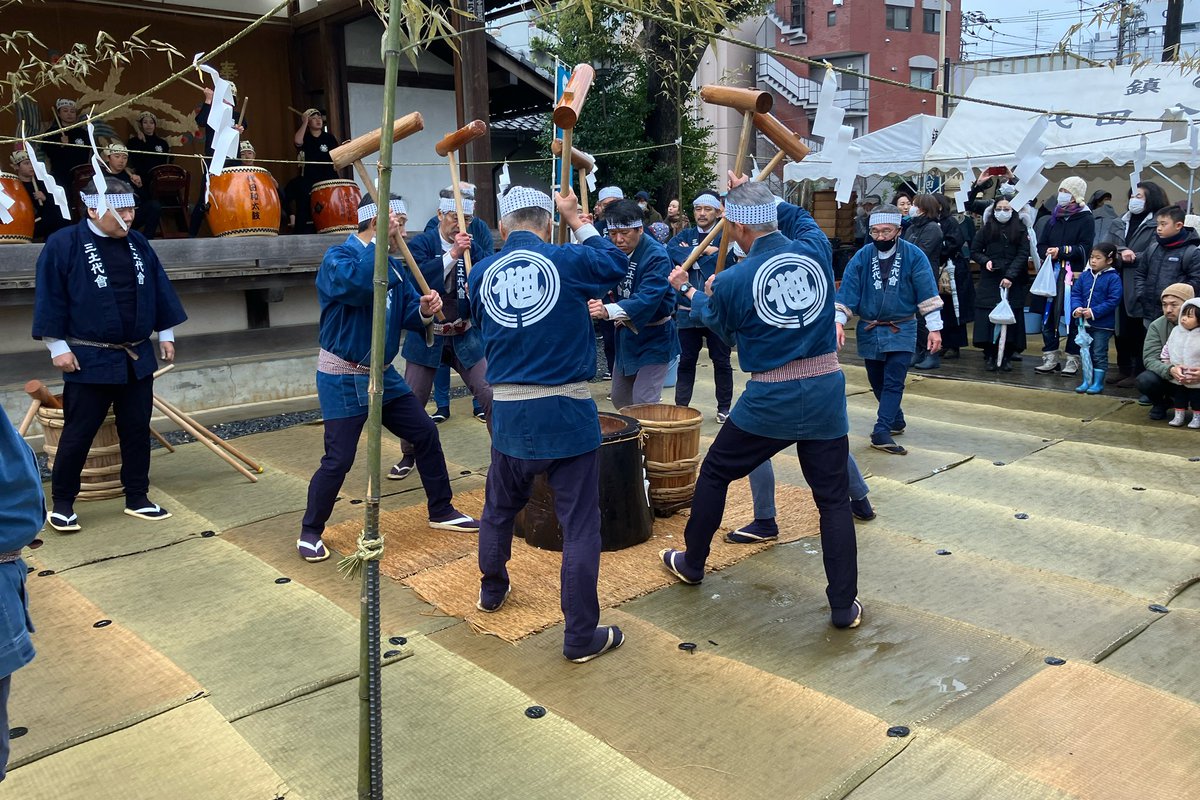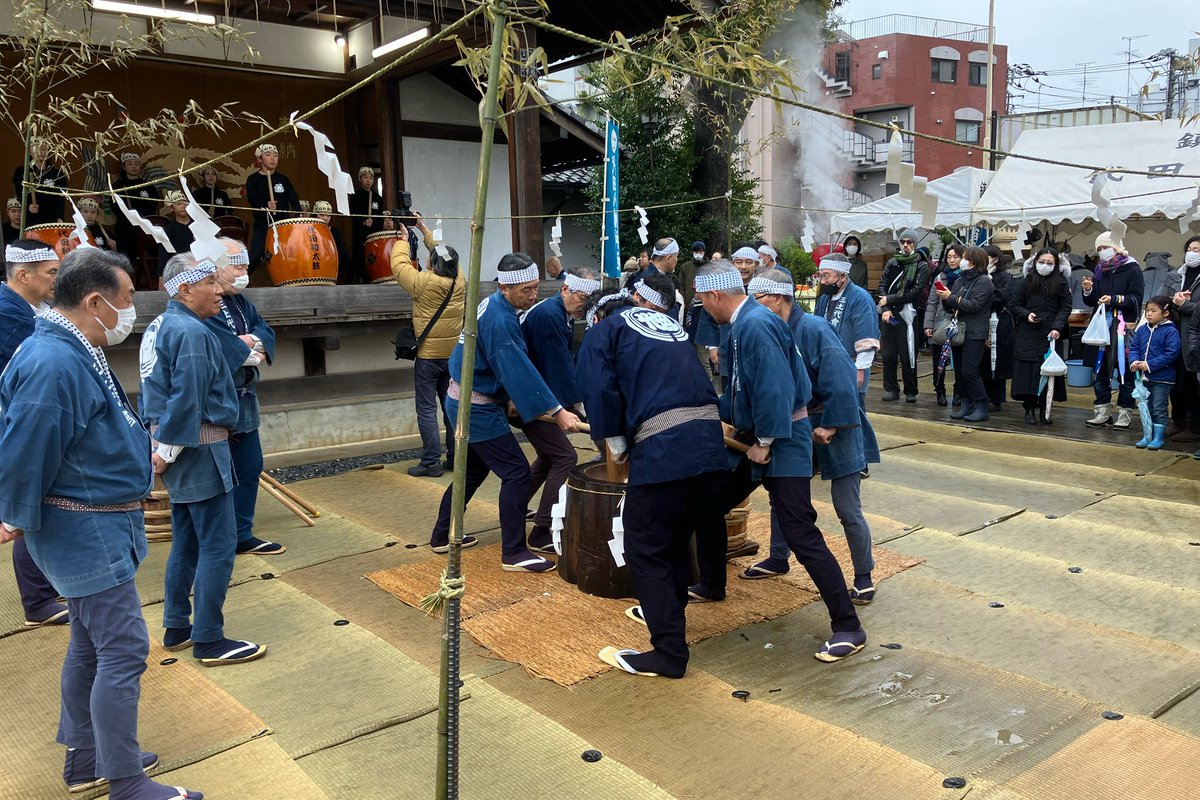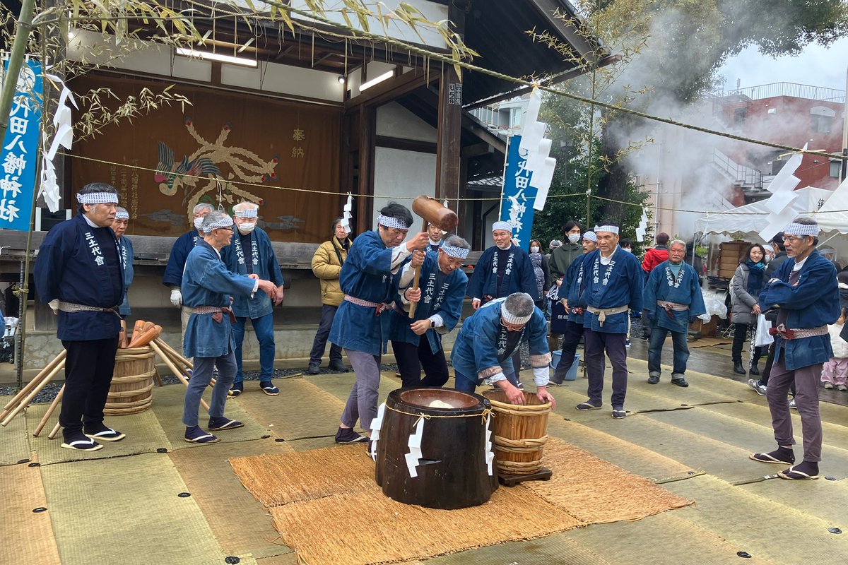 目の前で初めて観ましたが、これはとてもとても貴重なイベントです。6人や8人でお餅を搗く、その威勢の良さと手際の良さ、5分ほどで搗き終わるという流れに驚きです。代田の歴史に触れることができる、素晴らしい光景を観ることができました