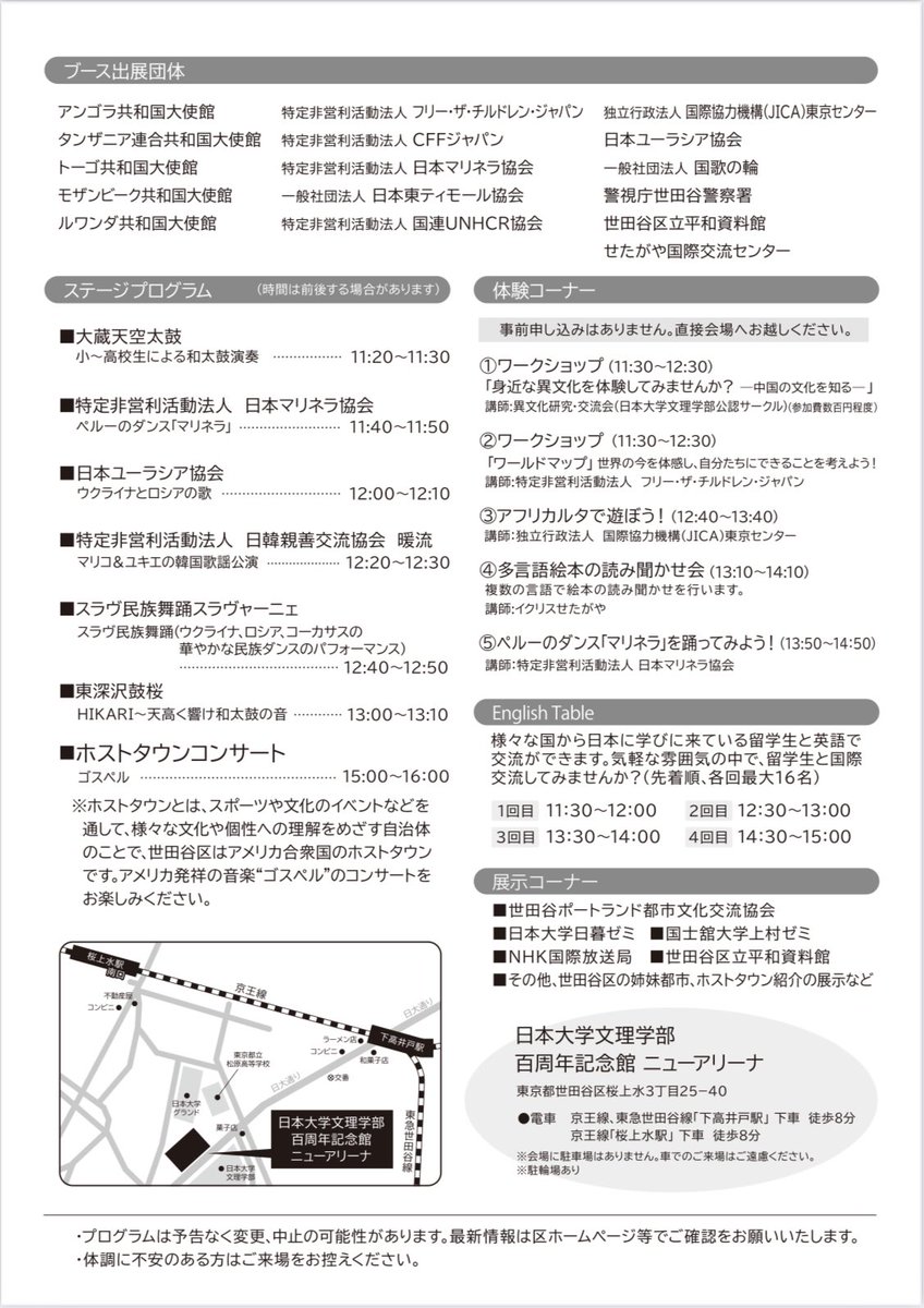 区内にある各国の大使館や、国際関係の団体等が集まって開催されます。アメリカ合衆国のホストタウンであることを記念したゴスペルコンサートもあります。