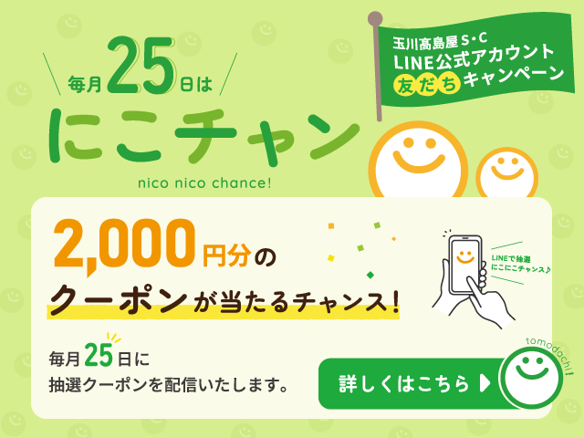 【LINE公式アカウント友だちキャンペーン にこにこチャンス】毎月25日は「にこチャン」!PickUpショップの2,000円分クーポンを抽選で25名様にプレゼント♪明日12:00配信!友だち登録をしてお待ちください!x.gd/LXrD7