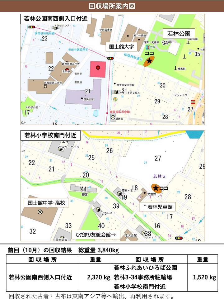 場所:若林公園南西側入口付近(例年と回収場所が異なります)、若林ふれあいひろば公園、若林3-34事務所、若林小学校南門付近