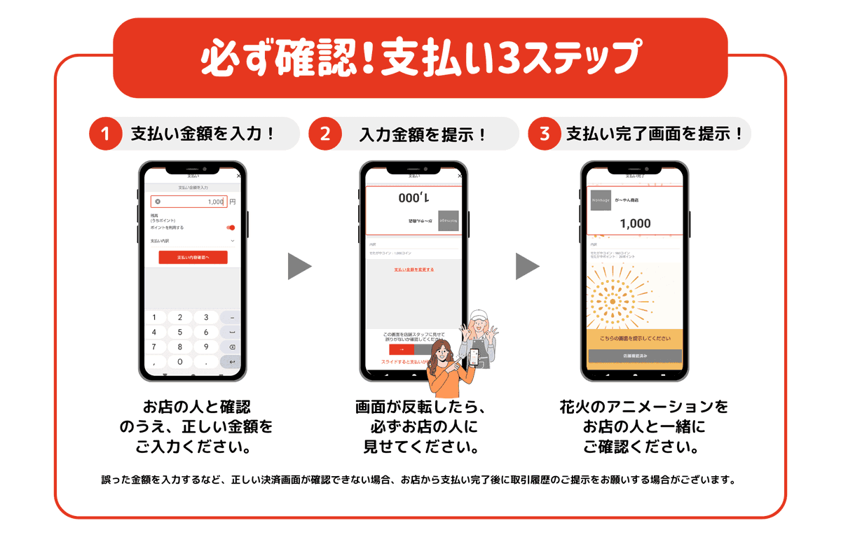 せたがやPayで決済を行う際は取引金額に間違いがないよう、金額入力画面に支払額を入力後、加盟店スタッフと一緒に入力した金額の確認をお願いいたします。