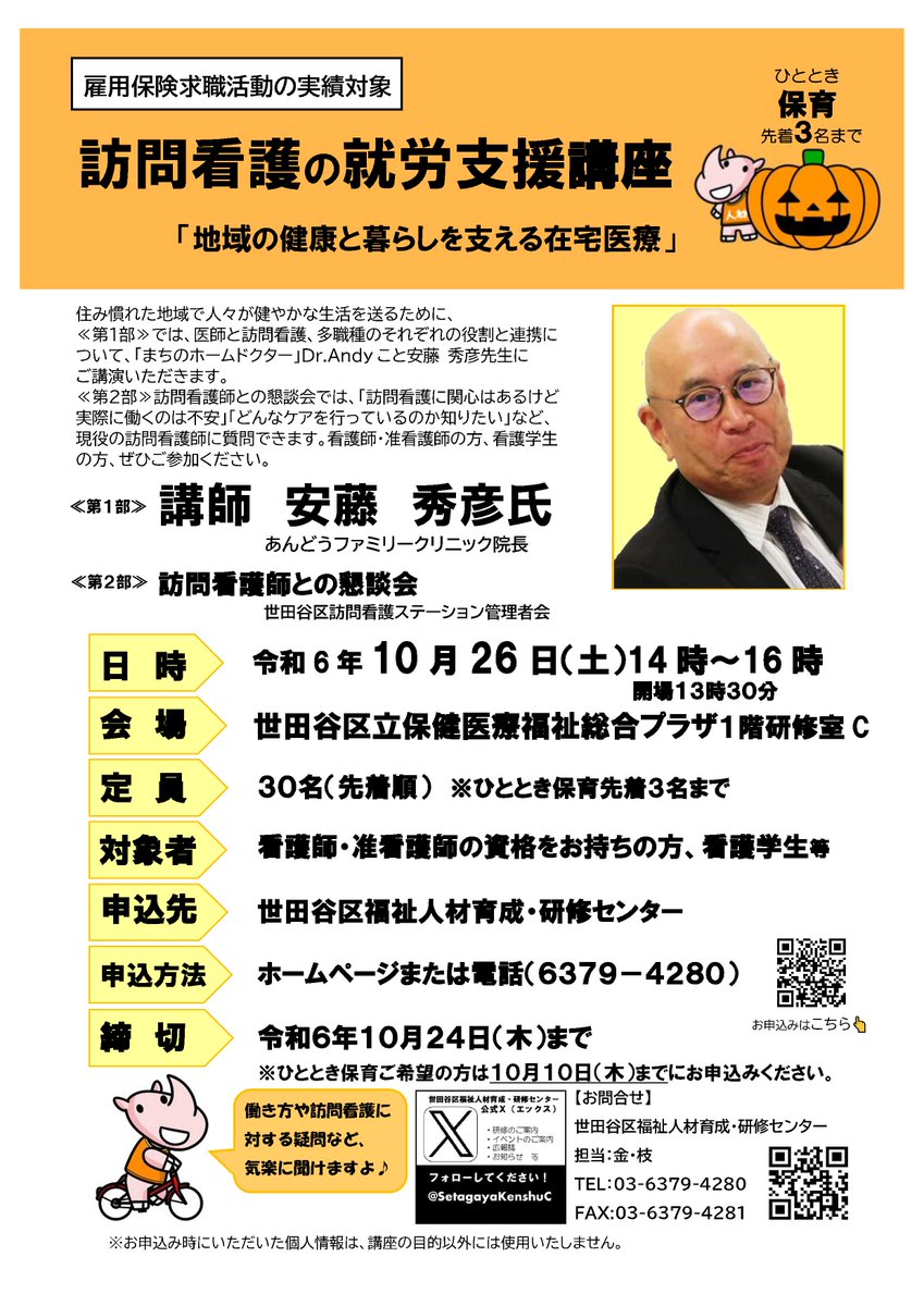 訪問看護の就労支援講座「地域の健康と暮らしを支える在宅医療」を開催。住み慣れた地域で健やかな生活を送るために、医師と訪問看護、多職種それぞれの役割について学びます。講師は安藤 秀彦先生。訪問看護師との懇談会もあります。詳細はHP参照。 #訪問看護 #就労支援 https://setagaya-jinzai.jp/lecture/view/1031…