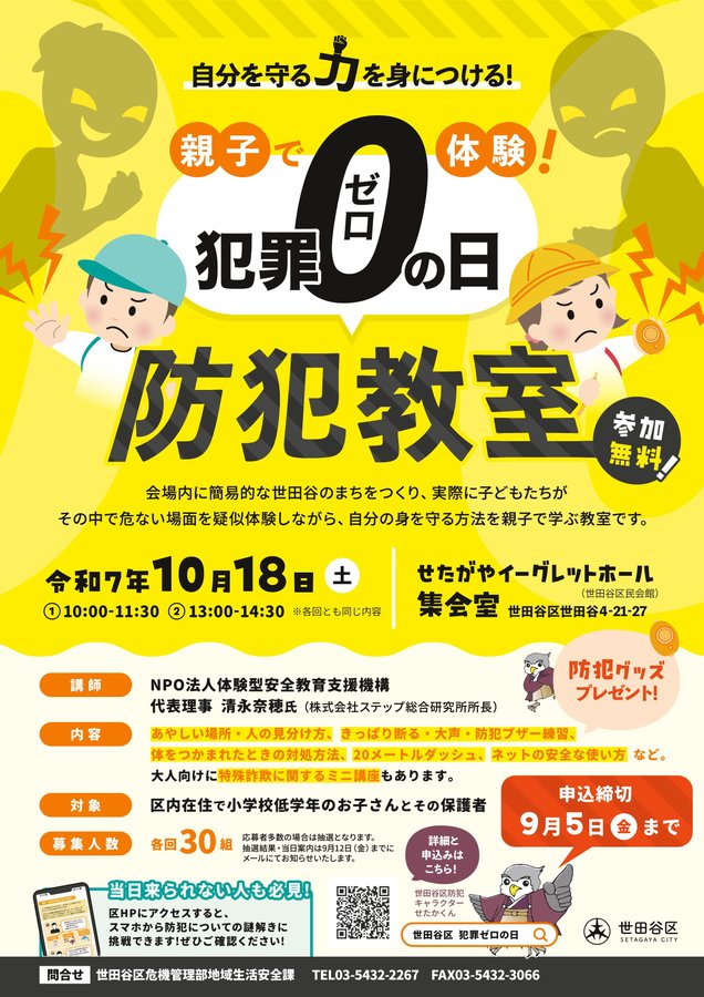 【親子で体験!犯罪ゼロの日防犯教室】区では10月18日(土)を世田谷区内犯罪ゼロの日として「親子で体験!犯罪ゼロの日防犯教室」を開催します。実際に危ない場面を疑似体験しながら、自分の身を守る方法を親子..