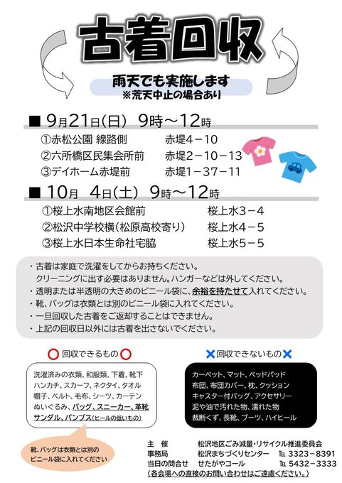 赤堤地区において古着・古布回収を行います!日時は、9月21日(日曜日)午前9時~正午までとなっております。回収場所等につきましては、区HPまたは添付チラシをご覧ください。#世田谷#古着#断捨離