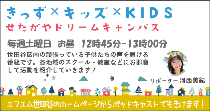 きっず×キッズ×kids~せたがやドリームキャンバス~毎週土曜日12:45~13:00リポーター#河西美紀世田谷区内の頑張っている子供たちの声を届ける番組今日(10/26)は千歳ダンスカレッジぜひお聴..
