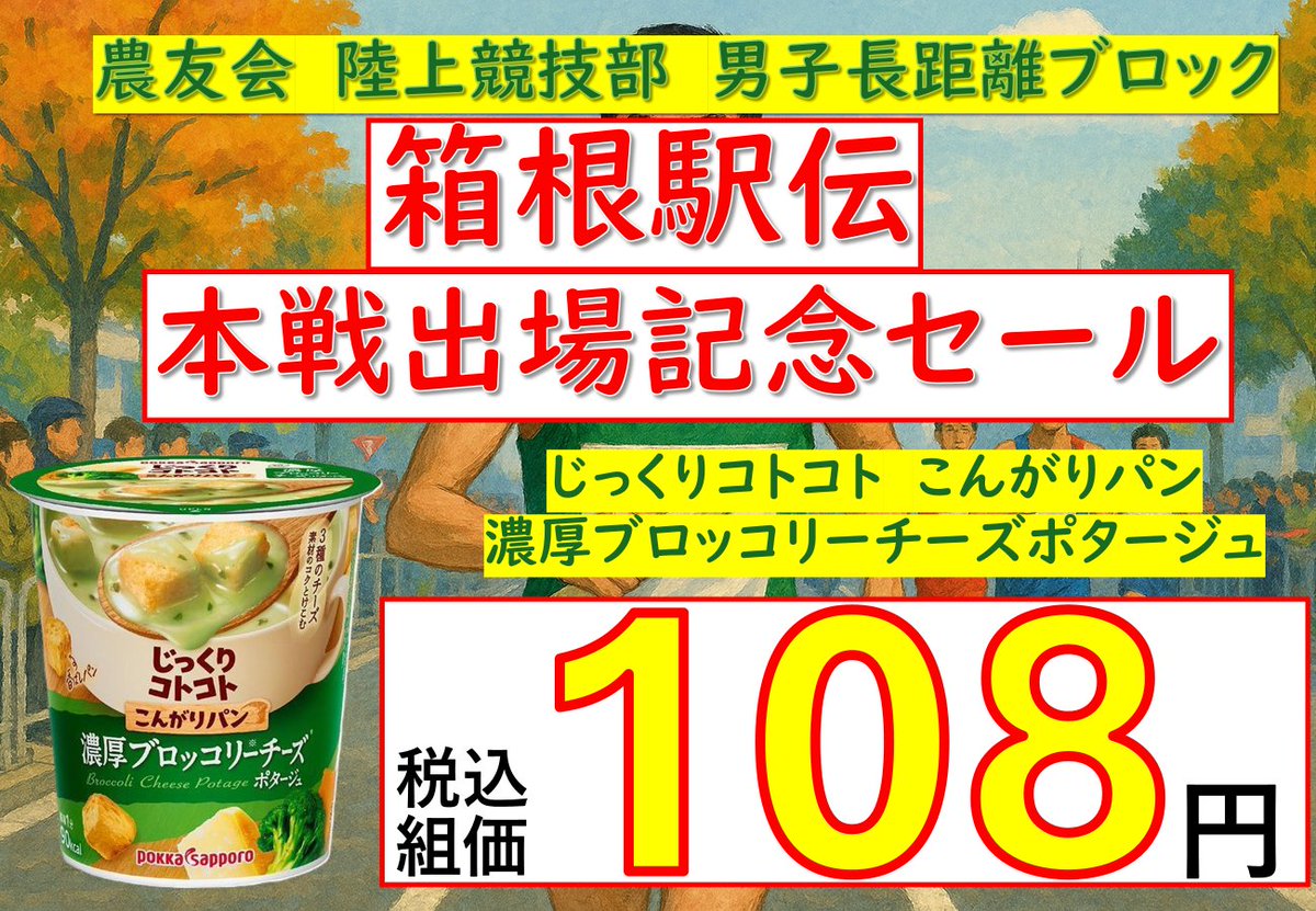 【農大生協購買】〈記念セール実施中!〉「第102回東京箱根間往復大学駅伝競走予選会」突破を祝し割引セールを実施します!じっくりコトコトブロッコリーチーズポタージュを通常169円のところ、108円で販売..