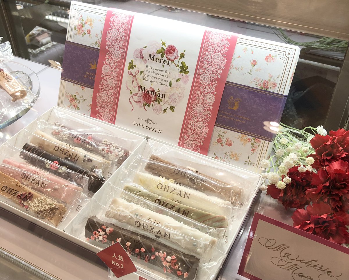 これにしよっかニャ〜・・😽❤️ 〈カフェ オウザン〉 「スティックラスク10本入 マシェリママン」❣️ かわいいデコレーションと掛け紙は母の日ギフト限定ニャンだって😸 ママもハッピーになるかニャ〜❓✨ アッシュ #日本初クロワッサンラスクのお店ニャン