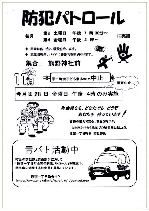 防犯パトロール毎月 第2土曜日午後7時30分〜/第4金曜日午後4時〜 に実施 ●日時:令和7年11月8日(土) ⇦中止(原一町会子ども祭りのため)令和7年11月28日(金) 午後4時〜●集合:熊野神