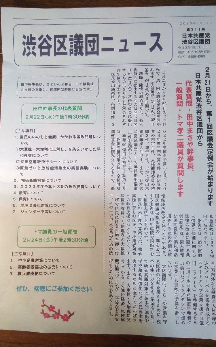 2/21から第1回定例渋谷区議会が始まり、22日午後2時頃から田中正也議員が代表質問、23日の午後3時頃から苫孝二議員が一般質問を行います。区民の皆さんの傍聴をお願いします。時間は、目安です。