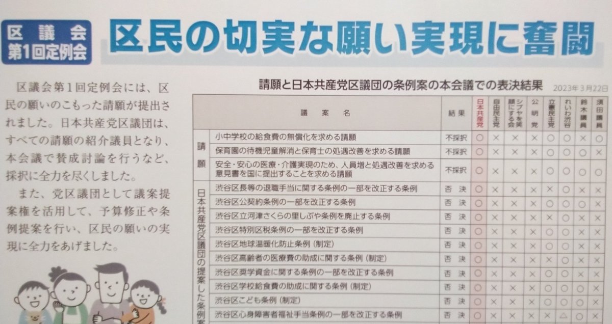 3/22の最終本会議で、区民から提出された「学校給食の無償化」「保育園の待機児童解消と保育士の処遇改善」「安全・安心の医療・介護の実現のため、人員増と処遇改善」のそれぞれを求める請願には、共産、立憲、れいわなど賛成。自民、公明、渋谷を笑顔にする会は、すべて反対。