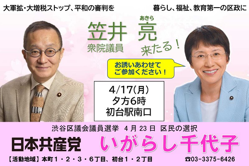 明日午後6時から笠井亮(あきら)衆議院議員が初台駅南口で街頭演説を行います。