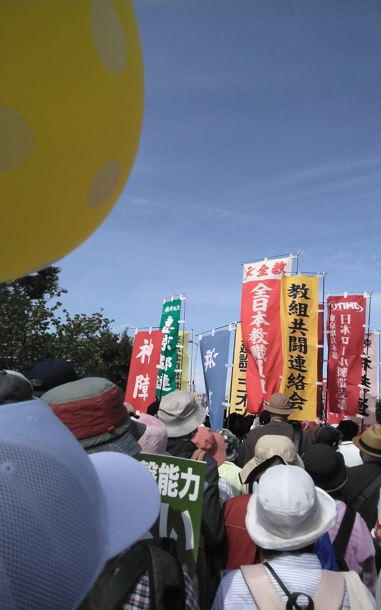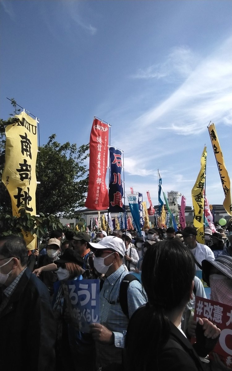 2万5千人が参加した憲法施行76周年記念集会後、豊洲駅までの1時間余りのパレードでは、「戦争反対」「軍事費より、くらしにまわせ!」「南西諸島にミサイルおくな!」「ロシアは、ウクライナからただちに撤退せよ!」と久しぶりのシュプレヒコール。沿道のマンションから拍手や手を振る姿も。
