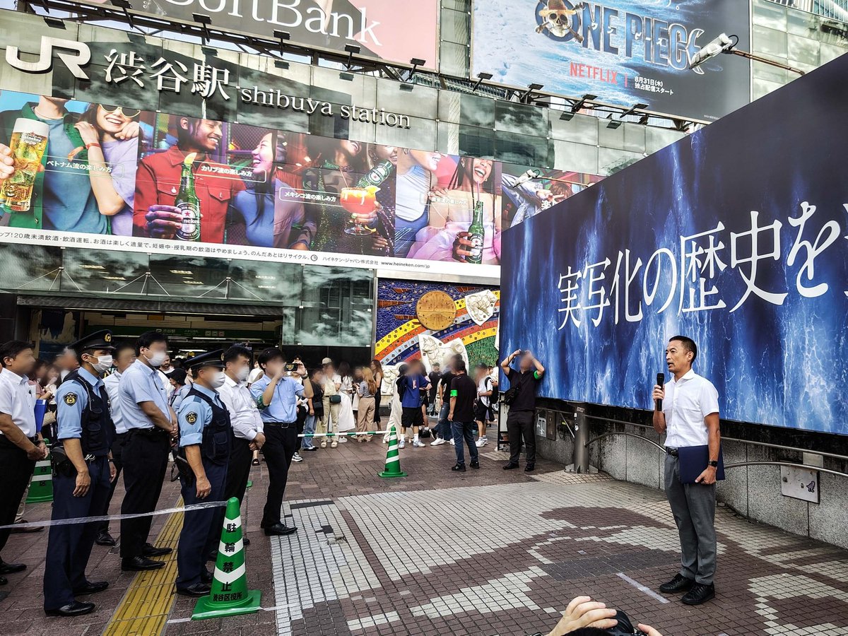 ハチ公広場前の区長の発表では、背後の看板広告が「ONE PIECE」でしたので、別のイベントを期待して人だかりができてたような。…