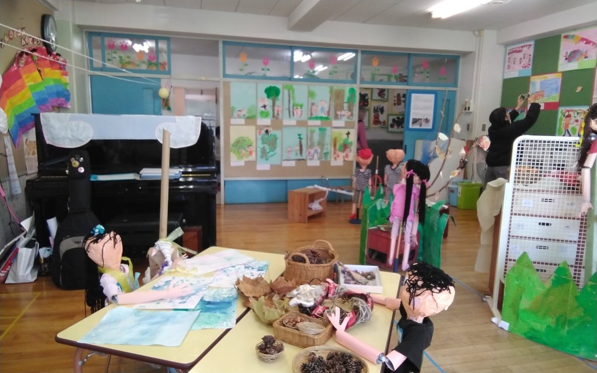 本町幼稚園の作品展を見せていただきました。幼稚園での楽しい毎日が目にうかぶ作品展でした。最後に園庭の青空の下、子どもたちと一緒に本町幼稚園の60歳の誕生の歌と本町幼稚園歌の音頭を踊って楽しみました。