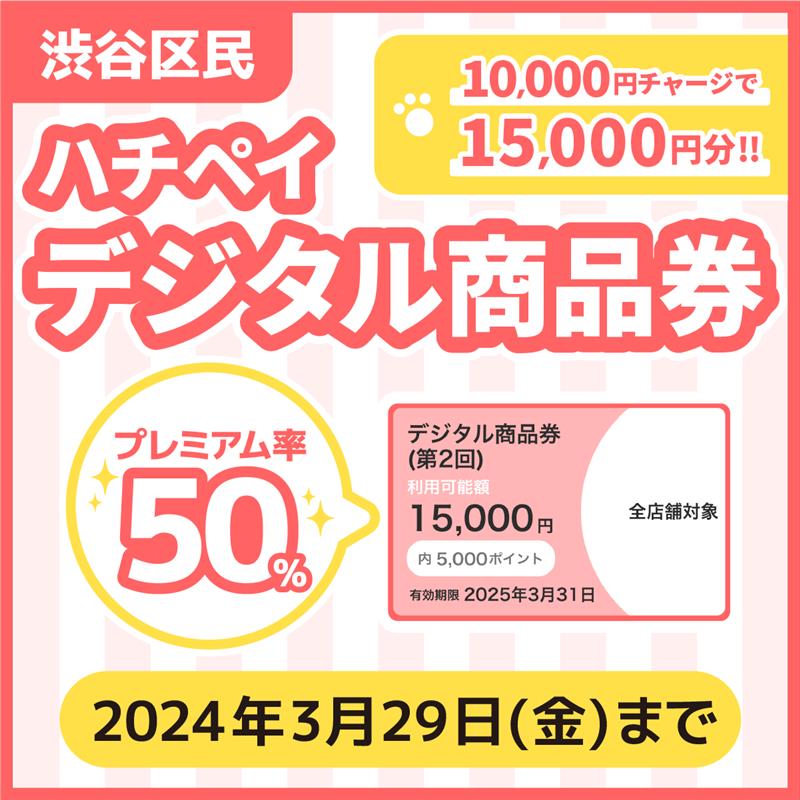 【プレミアム率50%ハチペイデジタル商品券(第2回)販売開始】本日よりハチペイ加盟店で15,000円分のお買い物ができる本商品券を1セット10,000円で販売します。購入にはマイナンバーカードでの渋谷区民認証が必要です。詳しくはハチペイHPで(産業観光課)