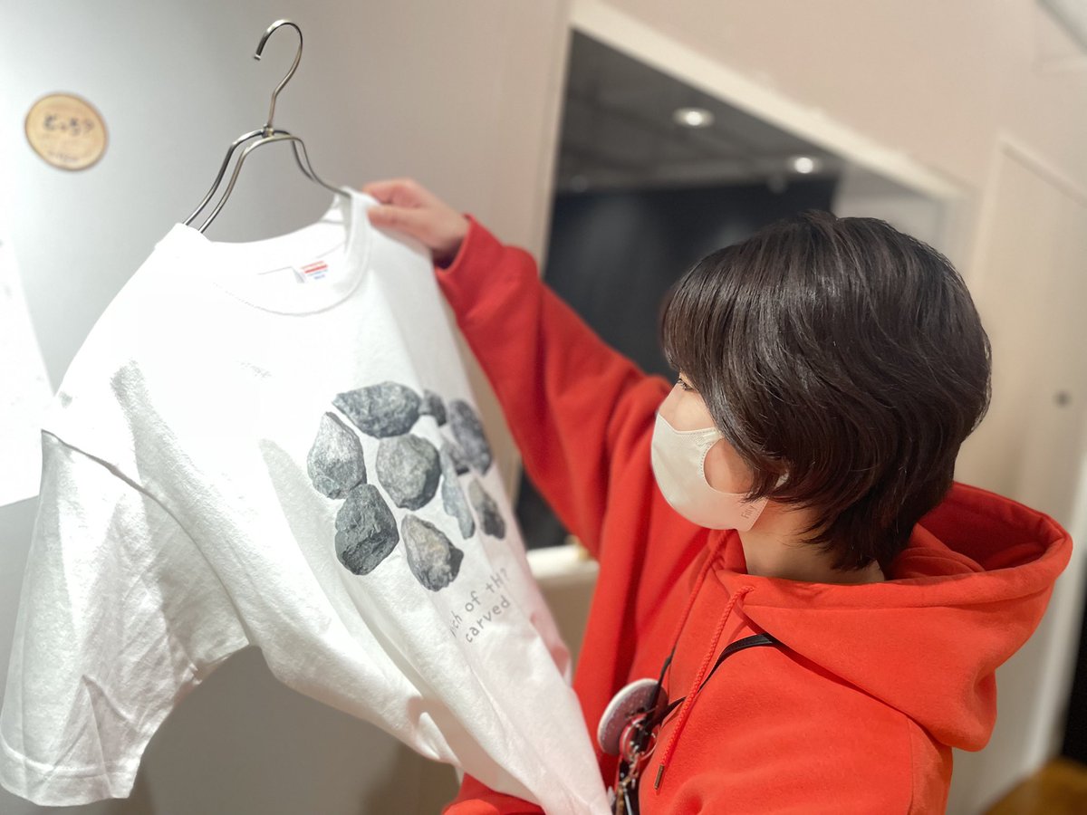 #キボリノコンノどっち展 では、書籍はもちろん、コンノさんの作品がプリントされたグッズなども販売しているのですが、おすすめしたいのがこちらのTシャツ。どちらのデザインもひとつだけ木彫りがまざっています。答えはせなかに‥‥?(きこ)