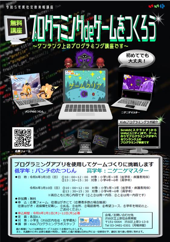 【開催】3/3(日)、10(日)に区内在住の小学生を対象とした「社会教育館講座:プログラミングdeゲームをつくろう」を開催します。