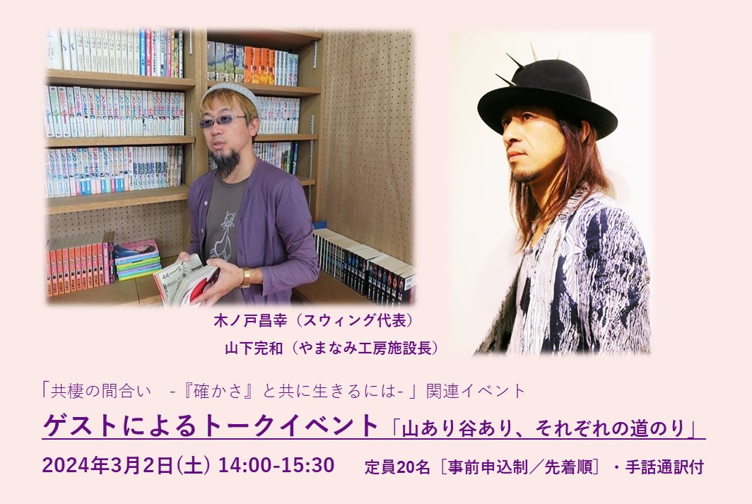 |◤申込受付中◢| トークイベント「山あり谷あり、それぞれの道のり」 3/2(土)14:00-15:30 #展覧会 #共棲の間合い #イベント ✅#スウィング 代表/木ノ戸昌幸氏と #やまなみ工房 施設長/山下完和氏による対談 *事前申込制/先着順 #手話通訳付き ぜひご来場ください! ⤵詳細