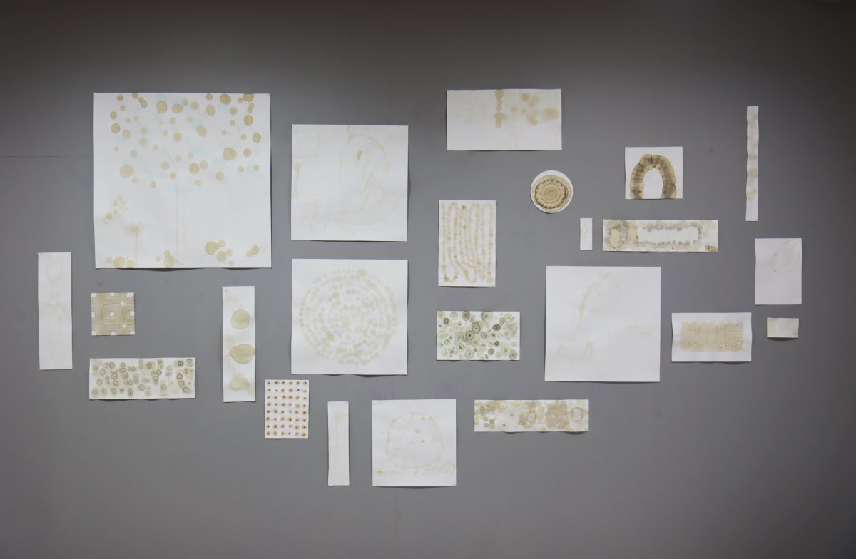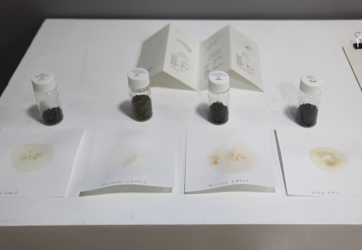 ワークショップ参加者たちが思い思いに糞でドローイングした作品を展示しています。