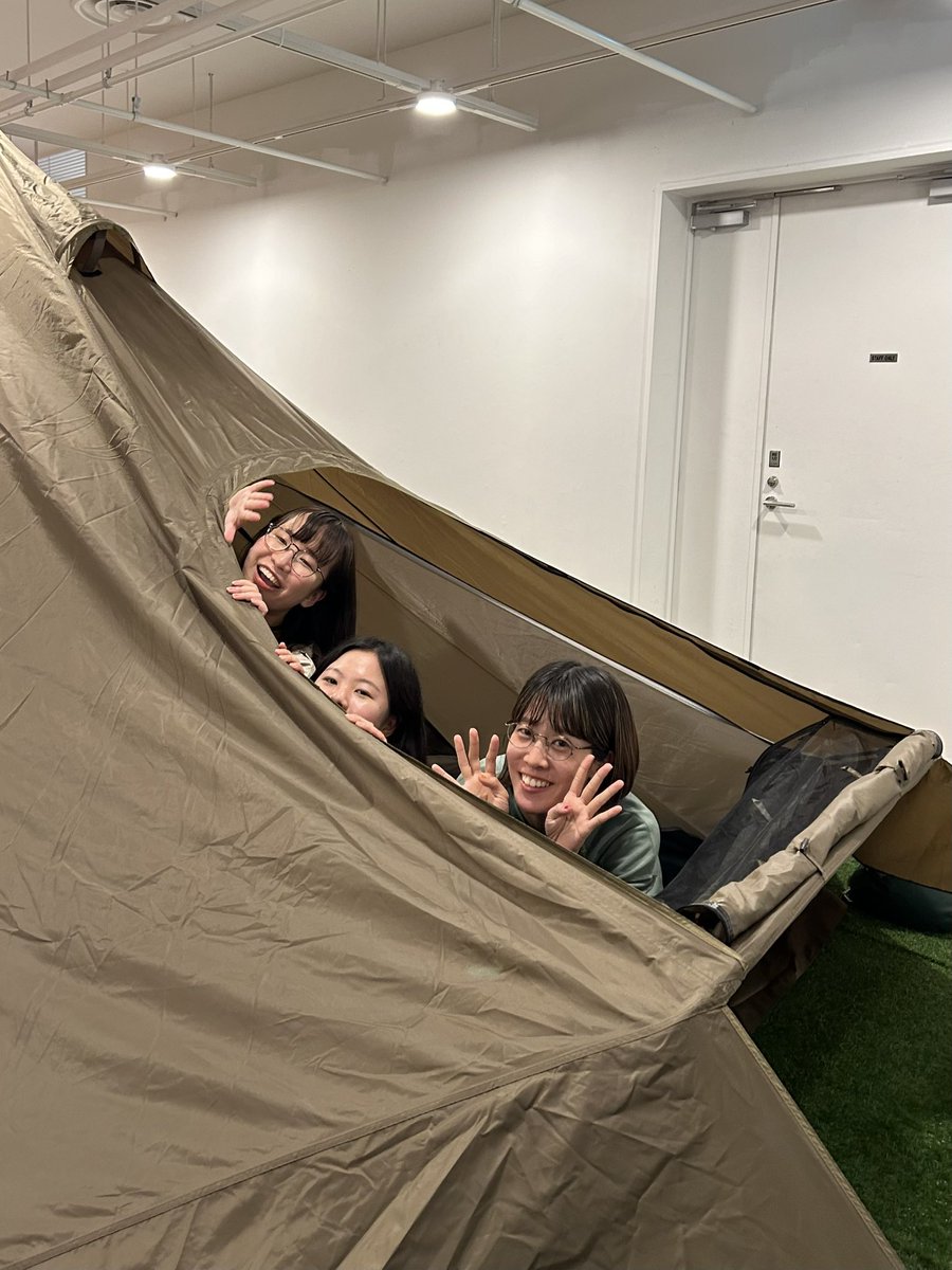 ぜひ体験してほしいアイテム代表、ほぼ日のキャンププロジェクト「yozora」のテント「kohaku duo」を張って、会場の温度が上がってきました!
