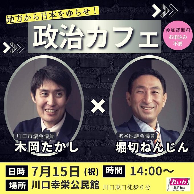「れいわ新選組地方から国をゆらせ!川口市議会議員木岡たかし5期×渋谷区議会議員堀切ねんじん4期コラボ対談第三弾」 木岡たかし議員の市政報告会 に私こと 渋谷区議会議員堀切ねんじんがまたまたゲスト出演させて頂きます政治カフェです。 7月15日(祝)幸栄公民館 会議室1号14:00~16:00