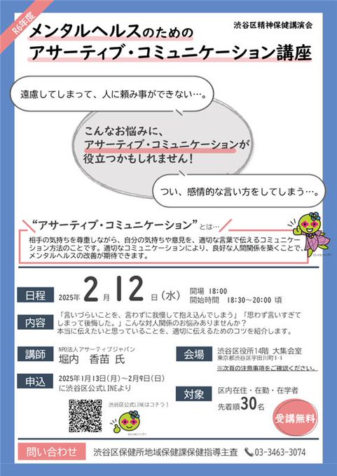 【お知らせ】精神保健講演会「メンタルヘルスのためのアサーティブ・コミュニケーション講座」を開催します。日時:2/12(水)18:30~20:00会場:渋谷区役所対象:区内在住・在勤・在学の人(先着30..