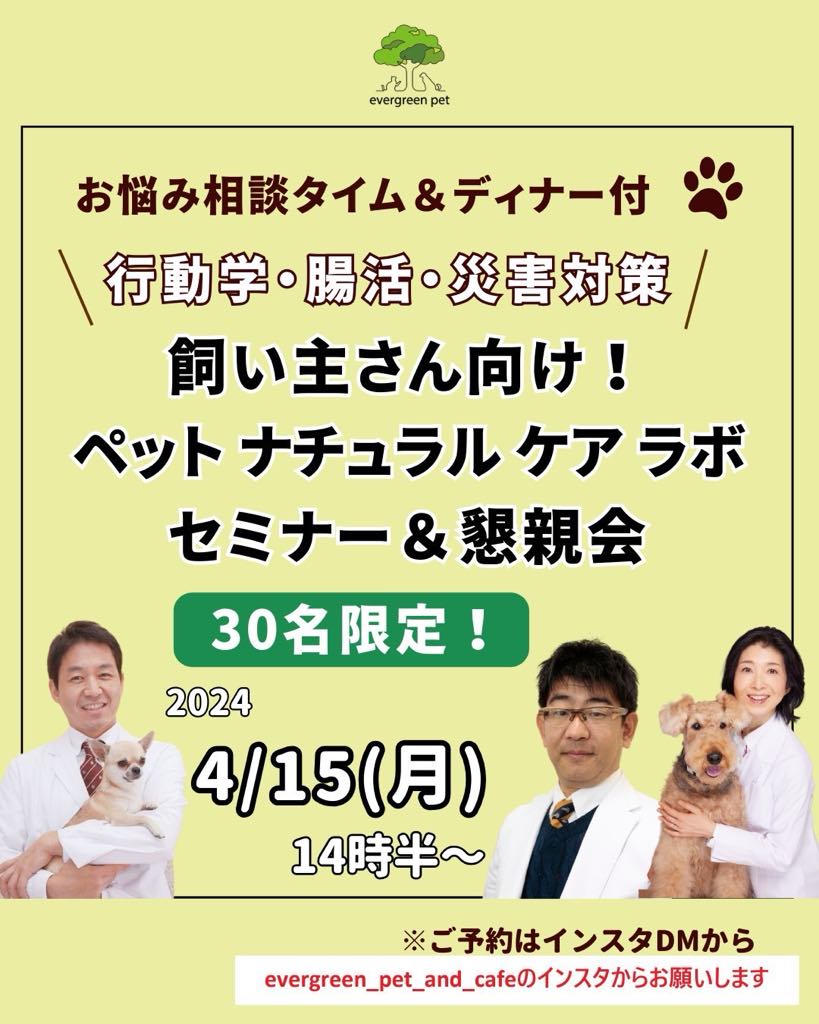 【セミナー】恵比寿南一公園にあるペットと入れるカフェ「エバーグリーンカフェ」でペットセミナーを開催。ペット界の博士3名を講師にお迎えして、スペシャルセミナー&懇親会を開催します🐶✨🐱①ペットの..