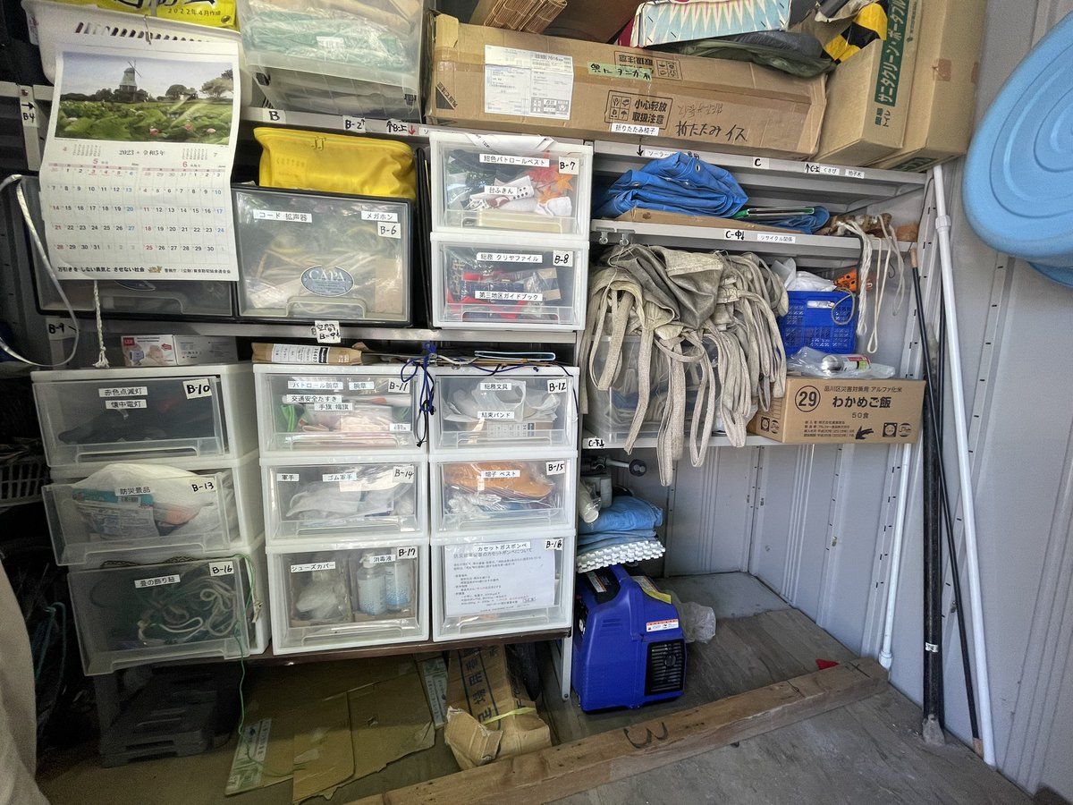 こちらの町会の運営をこしばは注目しています。およそ5軒から10軒を一つの組に構成して、運営の方針決定に参加し防災訓練では組長が組の被害状況を黄色いハンカチで把握するという試み。いつも沢山の気付きが得られます。防災倉庫は中身が一目瞭然!