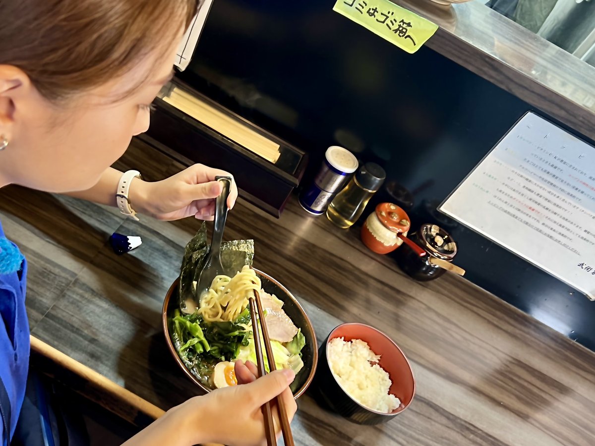 長く炊いたこだわりのスープは鶏ガラや豚骨の旨みが濃い!後味はさっぱり。無料のライスによく合う!